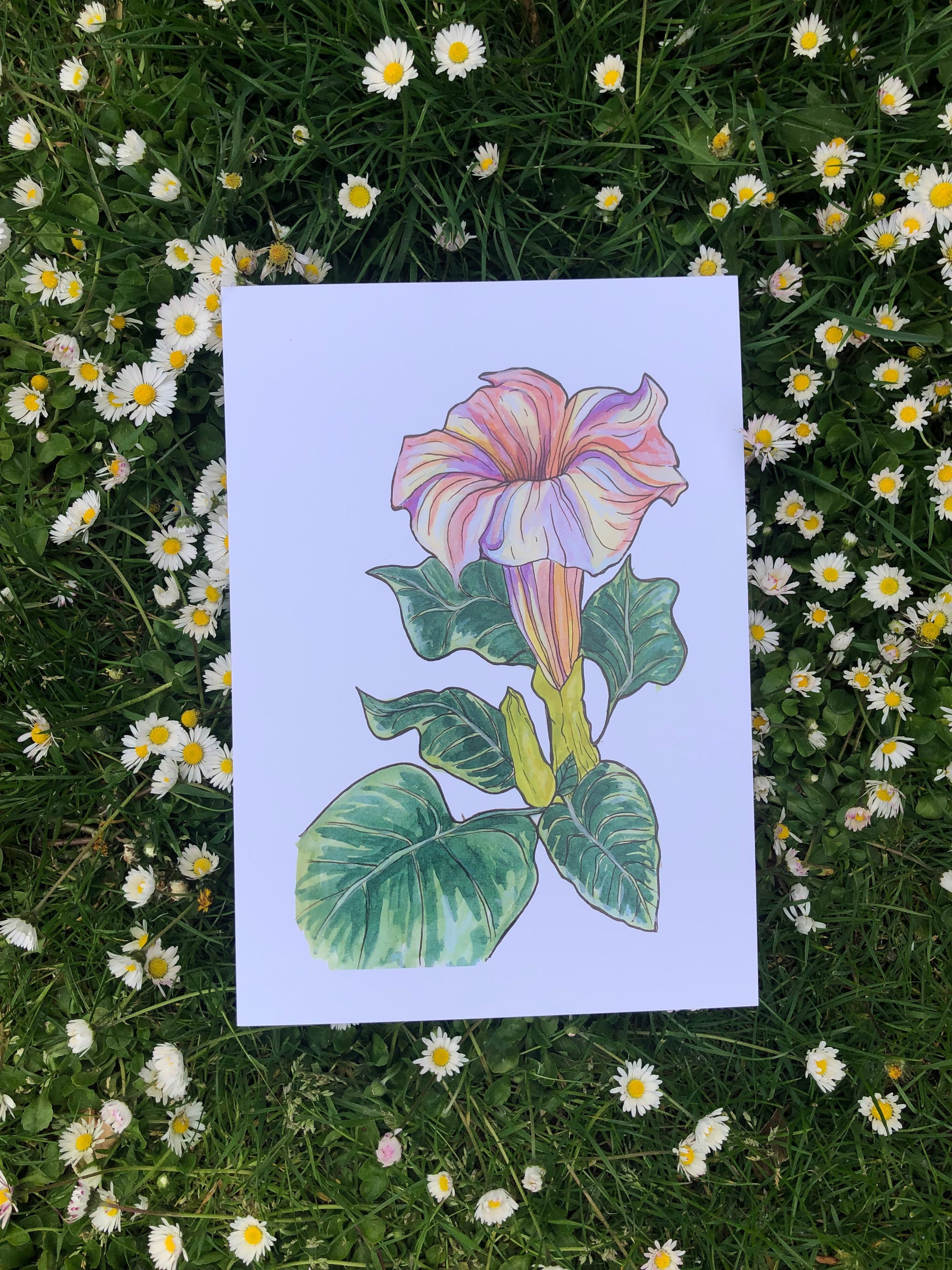 High quality A4 art print. This is a painting of the datura flower, a beautiful flower that creates psychedelic visions and releases negative energies.