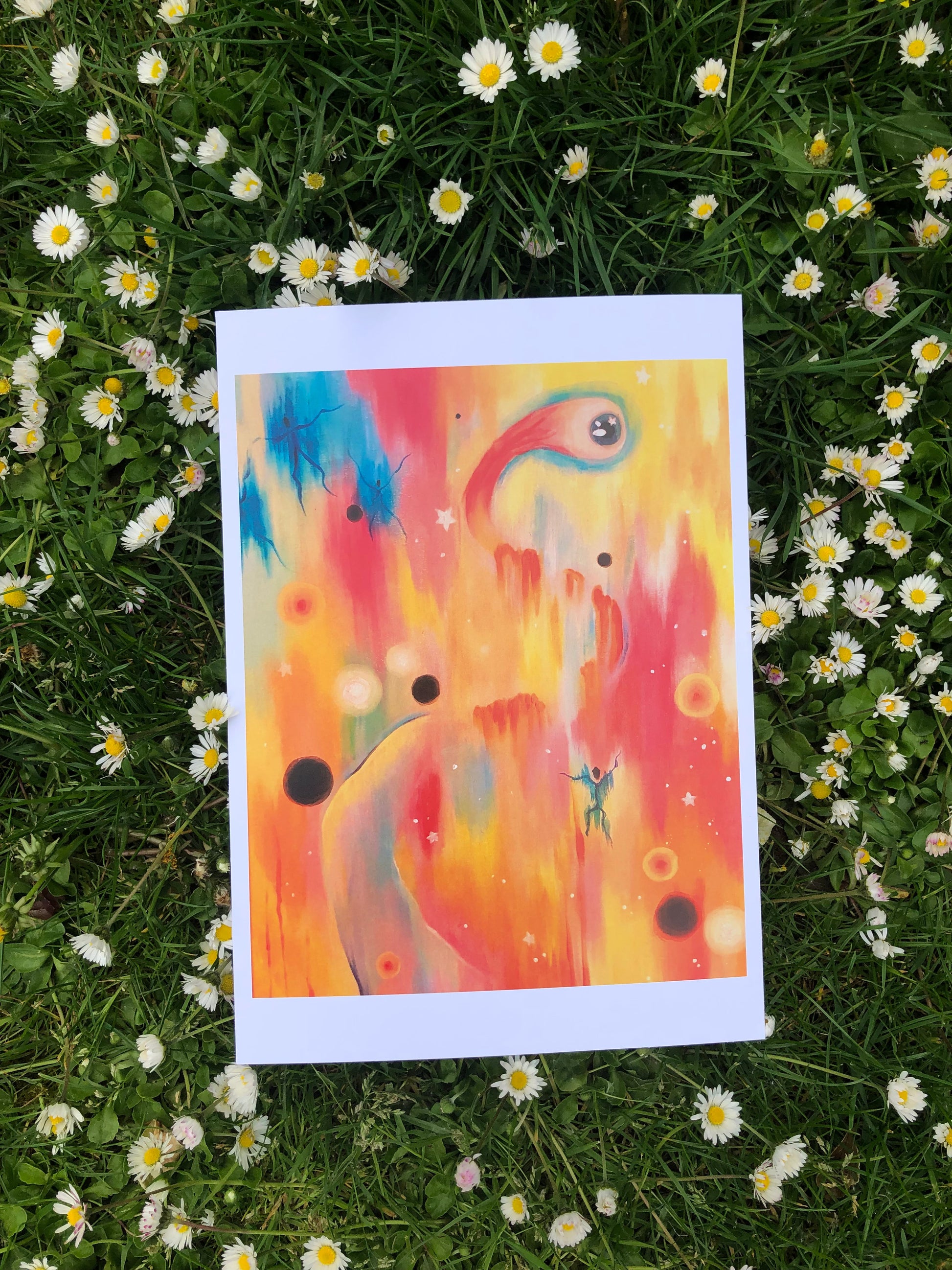 High quality A4 art print. This painting was inspired by the visual representation of travelling to the afterlife, and what i think that could look like. almost like a beautiful soup of souls.
