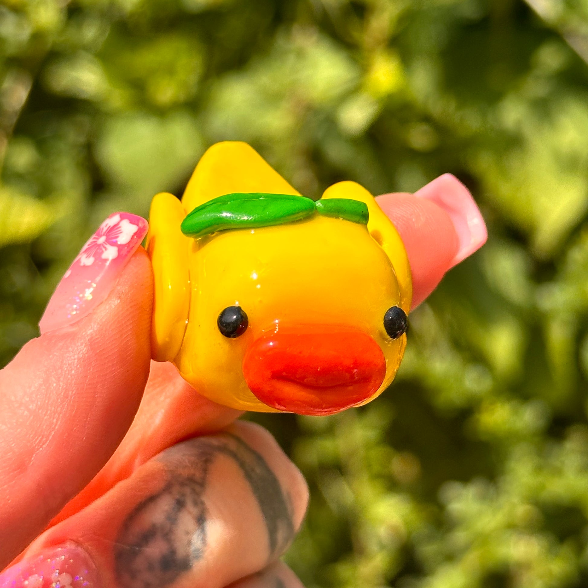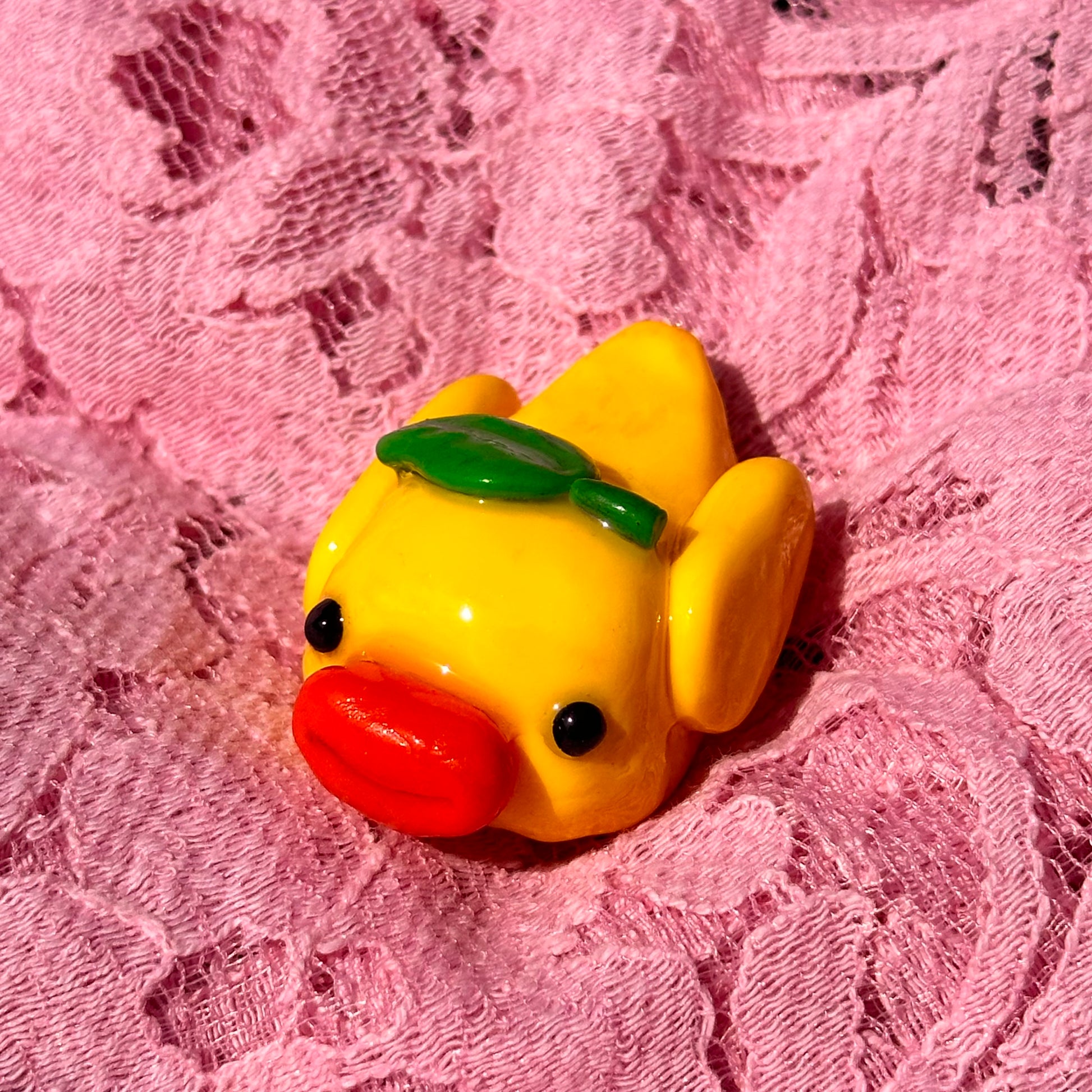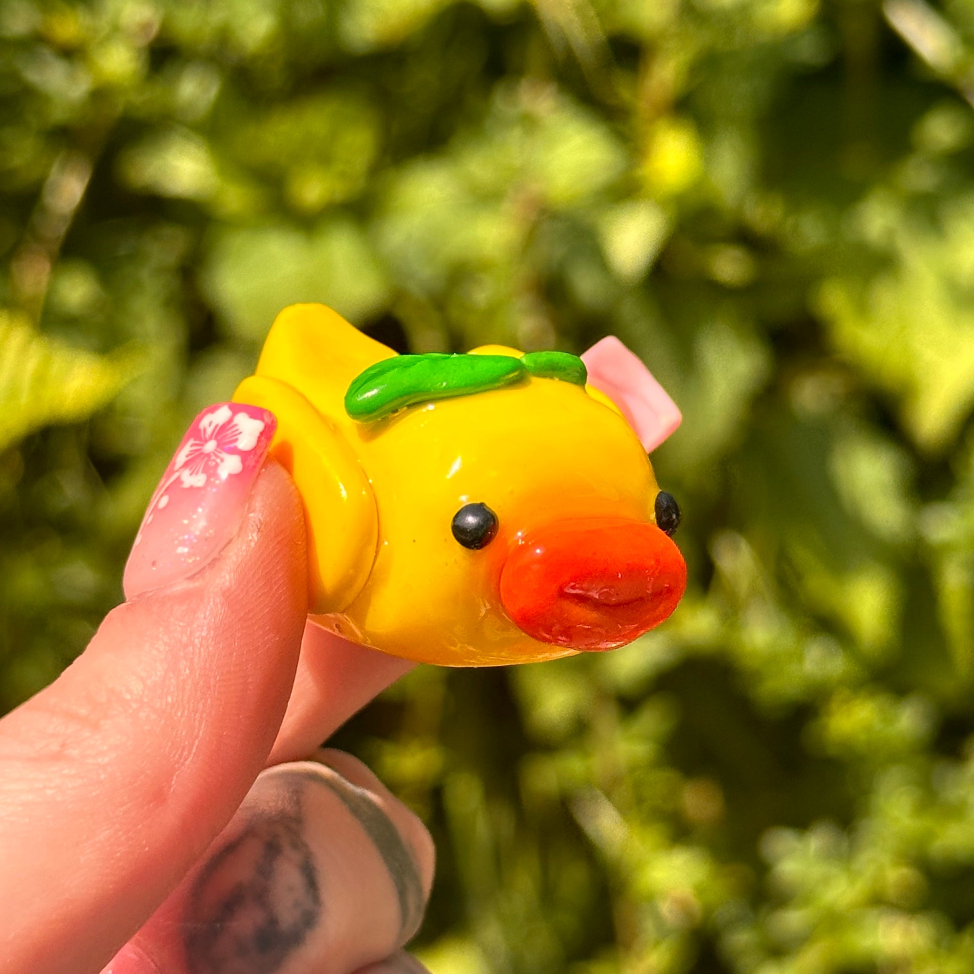 Cute handmade polymer clay desk friend of my character duck bestie. With a little leaf on his head 🌱🩷