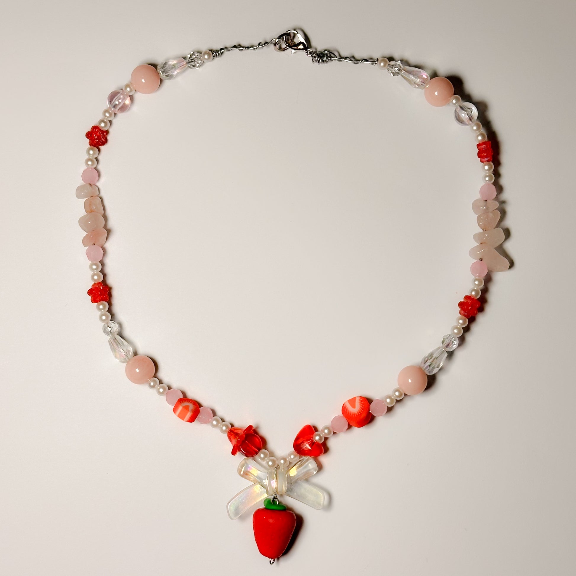 Handmade with care this strawberry necklace aims to bring joy and beauty into your daily routine. Rose quarts included in design.